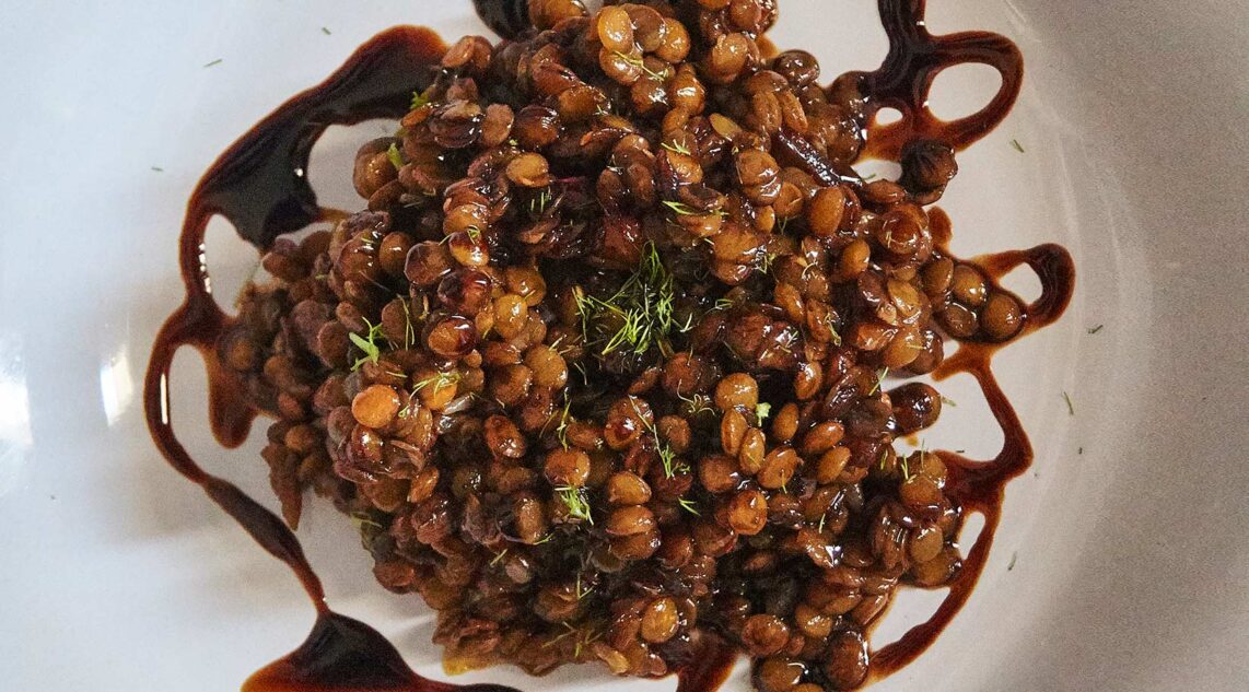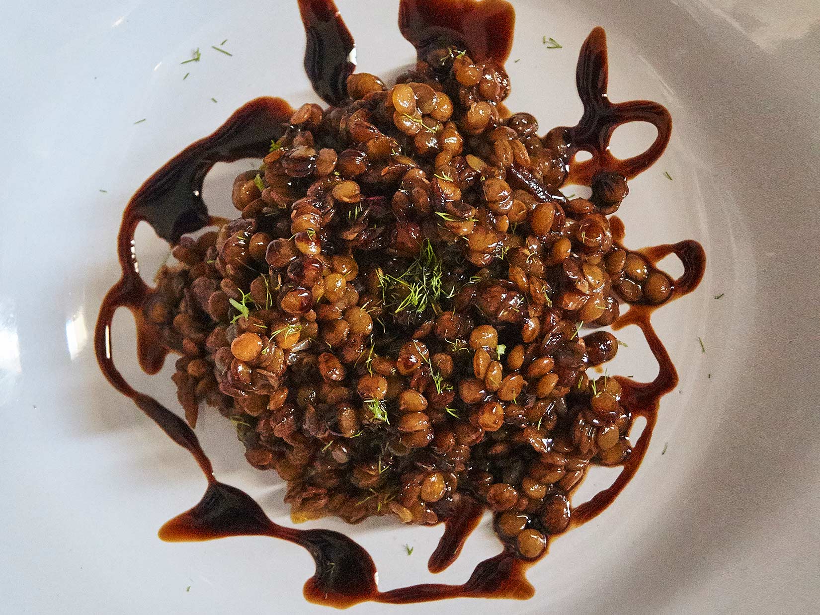 Ta linsene opp av kraften med en skje og ha dem i pannen. Deglasser med halvparten av balsamicoeddiken, bland godt og la det redusere litt. Tilsett eventuelt en skje eller to av grønnsaksbuljongen for å forlenge kraften litt.